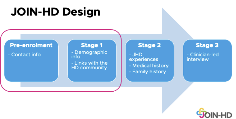 JOIN-HD is structured into 4 different milestones. We are currently in the Pre-enrollment and Stage, which collects demographic information of JHD families from across the globe.